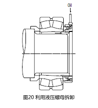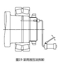 大型轴承,利用液压拆卸更加容易,如图19。在锥孔轴上的油孔中加压送油,使内圈膨胀,拆卸轴承。操作中防止轴承突然脱落,也可使用液压螺母拆卸衬套。图20是利用液压螺母拆卸衬套的方法。