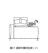 拆卸较小型的带紧定套轴承,如图18所示,用紧固于轴上的挡块支撑内圈,将螺母拧松后,垫上垫块,然后用榔头敲打衬套拆卸。图16是拉拔退卸套筒的作业。使用锁紧螺母进行拆卸。作业困难的情况下,如图17所示,在螺母圆周上设置多个螺栓孔,依靠拧入螺栓来拉拔衬套。